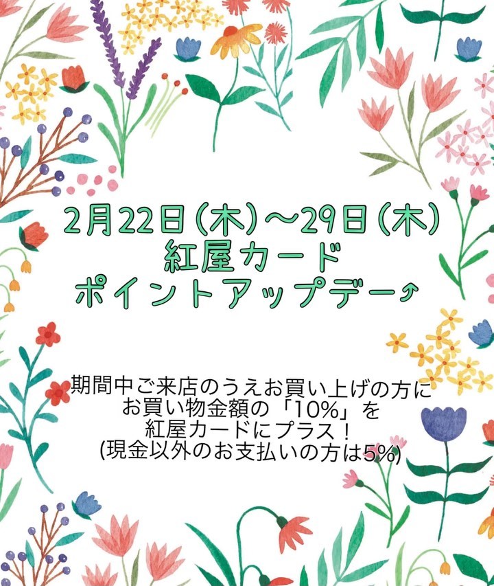 2月22日(木)スタート▶️29日(木)まで、紅屋カードポイントアップデー⤴️を開催中です✨