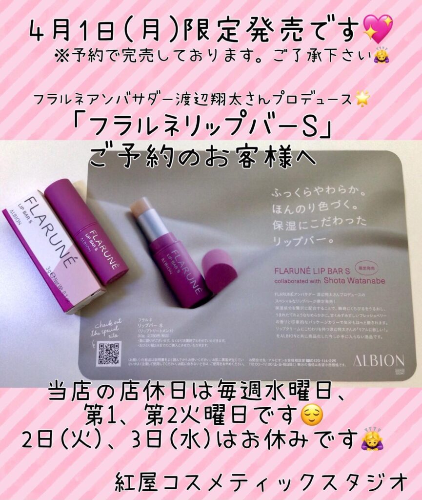 4月1日、渡辺翔太さんプロデュースのスペシャルなリップバーが限定発売です❣️ すでに予約で完売ですが、当店の店休日が毎週水曜日と第1、第2火曜日となってます。ご確認の上ご来店下さいませ\nまた、ご予約頂いた商品の取り置きは4月30日までとさせて頂きます。ご来店を心よりお待ちしております\n\nアルビオンの代表商品、薬用化粧水「スキンコンディショナーエッセンシャルN」の誕生50周年を記念して、スペシャルな限定品が2品、5月18日に発売✨\n※485mlの超BIGサイズ 11,000円(税込)\n※165ml+新発売クレンジングバー15g+スキコンペーパーマスクが入ったコフレ 5,500円(税込)\n\n4月1日より予約スタート‼️\n数量限定につき無くなり次第終了となります‍♀️