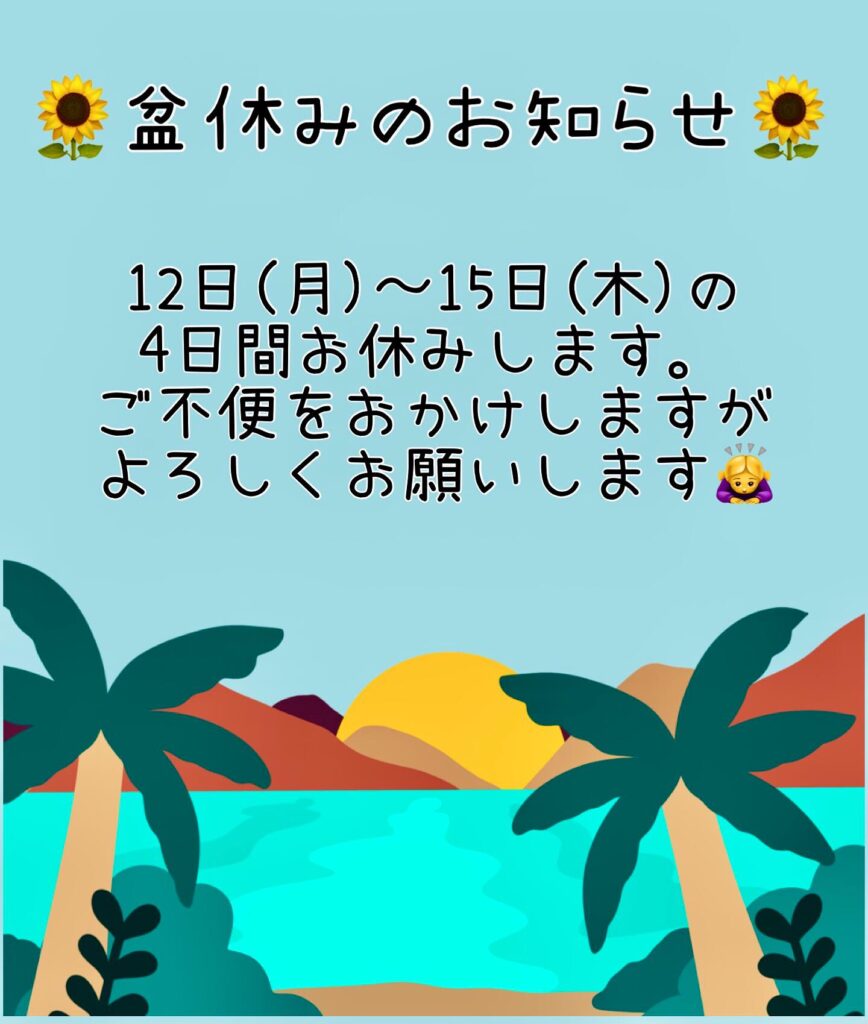 8月12日(月)〜15日(木)の4日間、盆休みとさせて頂きます。ご不便をおかけしますが、よろしくお願い致します🙇♀️