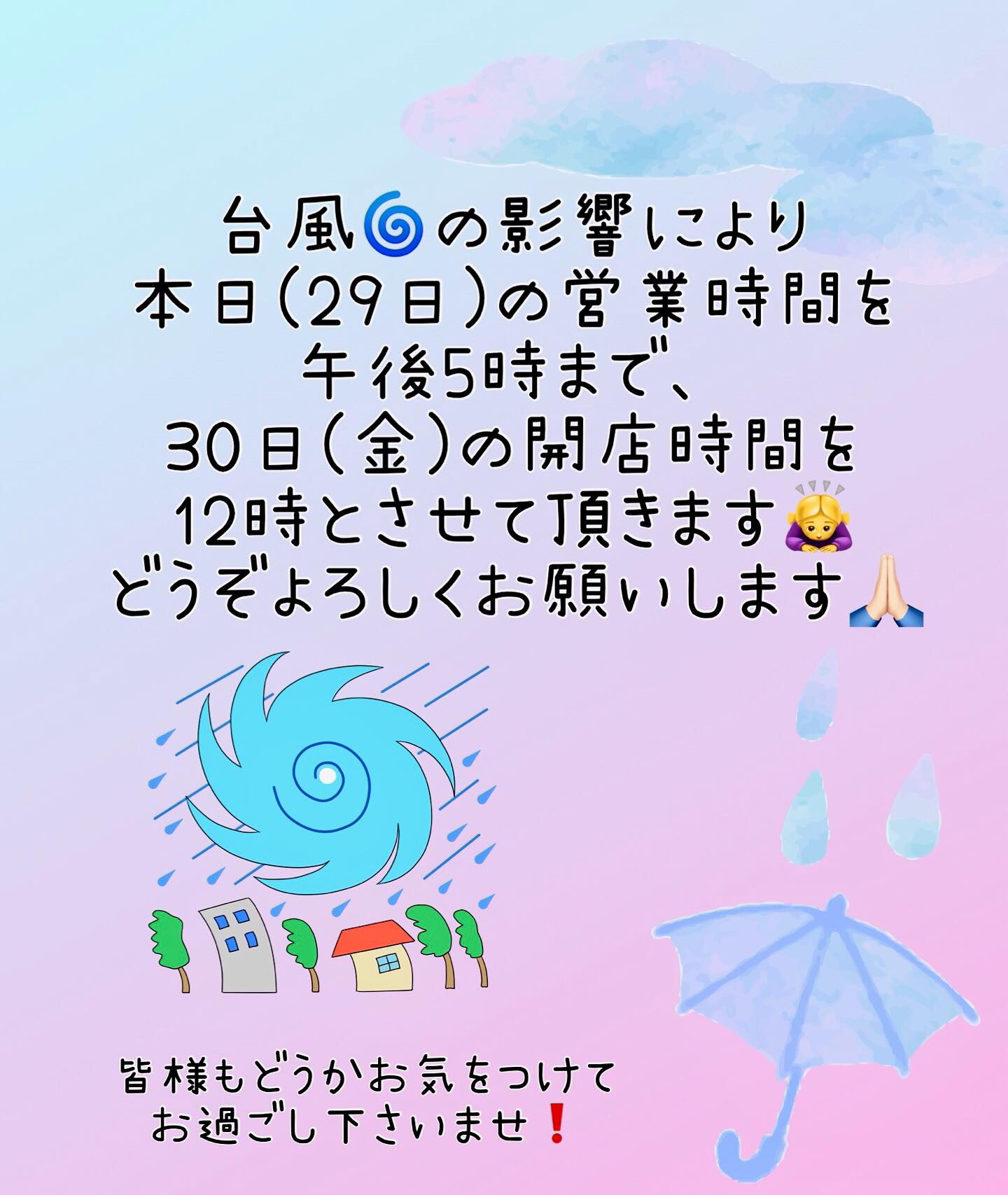 30日(金)につきましては午後12時開店の予定ですが、台風🌀の状況によっては変更も考えております。その際にはまたお知らせ致します。