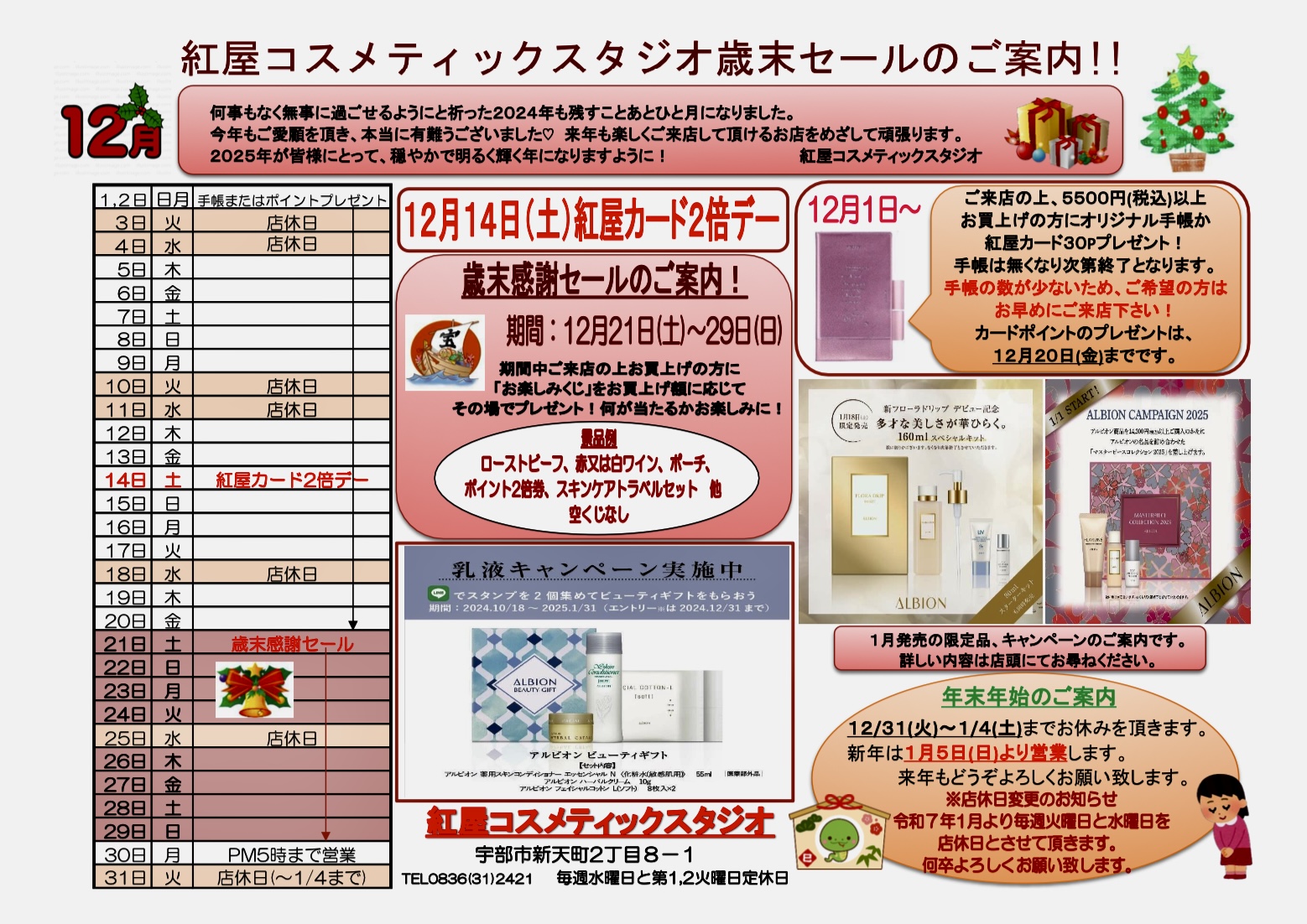 - 1日(日)〜手帳又は紅屋カードポイントプレゼント(手帳は無くなり次第終了、ポイントは12月20日まで)
