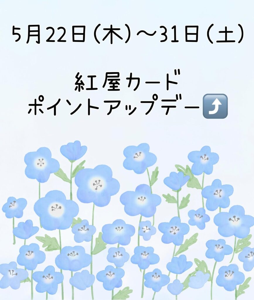期間中お買上げの10%を紅屋カードのポイントにプラス入力します❣️(現金以外のお支払いの方は5%です)